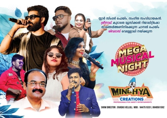 സ്റ്റാർ സിങ്ങർ ഫെയിം സംഗീത സംവിധായകൻ ശ്രീനാഥ് കൂടാതെ മ്യൂസിക്കൽ റിയാലിറ്റി ഷോ താരങ്ങൾ അണിനിരക്കുന്ന ചാനൽ ഫെയിം ശിവദാസ് വെള്ളോളി നയിക്കുന്ന മ്യൂസിക്കൽമെഗാ നൈറ്റ് പ്രോഗ്രാംലേക്ക് ഏവർക്കും സ്വാഗതം... ഷോ ഡയറക്ടർ ശിവദാസ് വെള്ളോളി :- വിളിക്കൂ : 94475 15331.